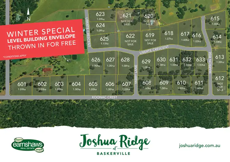 Perched high on the Darling Escarpment, Joshua Ridge is rolling green pastures bordered by natural bushlands and nature reserves. Each of the one hectare lots are parkland cleared, fully fenced and have had the service trench with power, water and phone conduit installed with draw sting. Significantly reducing the costs usually associated with rural living. Site clearing of the 1000sqm building envelope has been done for you as well.