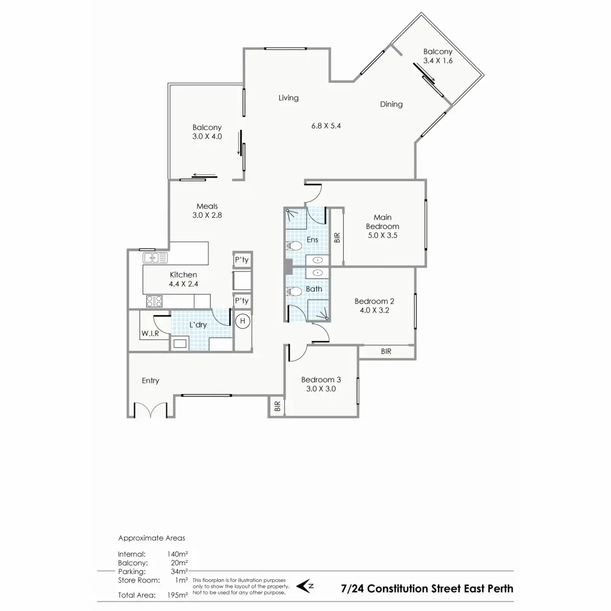 Internal: 140sqm, Balconies: 20sqm, Cars: 34sqm, Store: 1sqm, Total: 195sqm