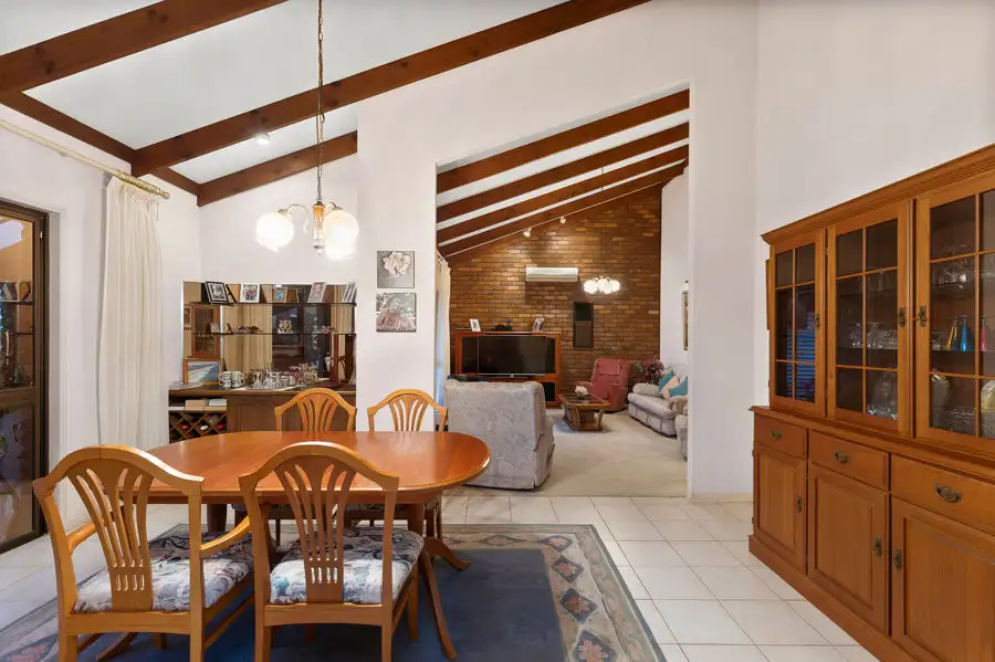 * Enter the formal living room adorned with a captivating feature brick wall. The grandeur of high ceilings graced with exposed timber beams creates an atmosphere of character.