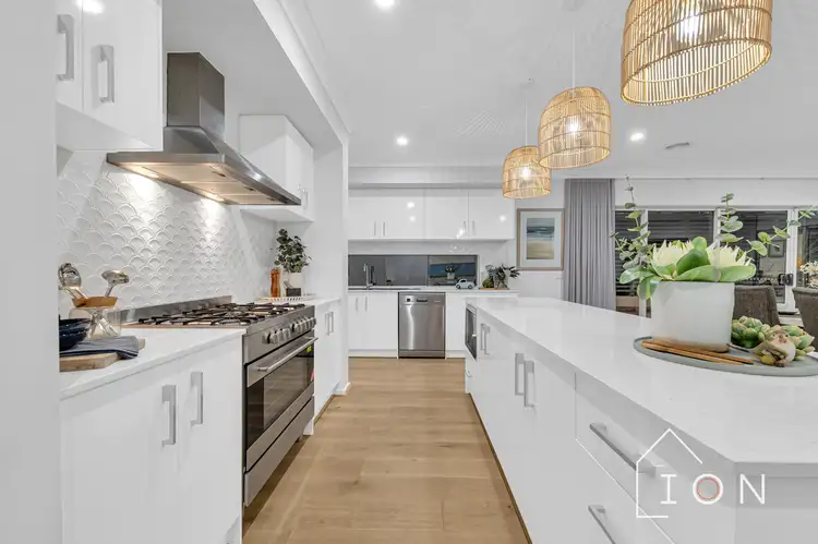 • Kitchen featuring an island with pendant lights, stone benches, tiled splashback, and a generous butler's pantry with stainless steel dishwasher, inbuilt microwave, and gourmet 900mm oven with gas burner cooktop
