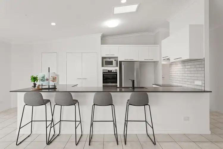 - Stylish open kitchen including sleek stone benchtops, crisp cabinetry and subway tiling