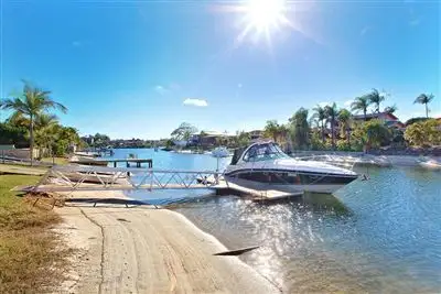 Property condition: Renovator, Good Property Type: House House style: Lowset Garaging / carparking: Internal access, Double lock-up, Off street Construction: Plaster, Timber and Brick veneer Joinery: Aluminium Roof: Tile and Concrete Insulation: Ceiling Walls / Interior: Gyprock Window coverings: Curtains, Blinds (Vertical) Electrical: TV points, TV aerial, Phone extensions Property Features: Smoke alarms Chattels remaining: Dishwasher Pontoon: Blinds, Drapes, Fixed floor coverings, Light fittings, Stove, TV aerial Kitchen: Original, Separate cooktop, Breakfast bar and Finished in (Laminate) Main bedroom: King and Built-in-robe Bedroom 2: Double and Built-in / wardrobe Bedroom 3: Double and Built-in / wardrobe Additional rooms: Family Family Room: Ceiling fans Views: Water, Waterfront Aspect: East Outdoor living: Entertainment area (Covered, Other surface), BBQ area (with lighting, with power), Verandah Fencing: Land contour: Flat, Flat to sloping Grounds: Tidy Sewerage: Mains Locality: Close to schools, Close to shops, Close to transportLand details