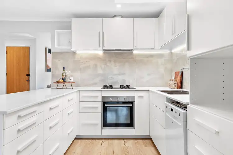 • Open-plan kitchen with stone benchtops, skylight, modern appliances, and seamless flow into the living area.