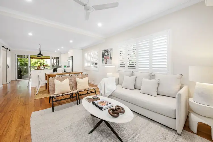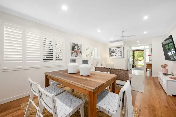 The entry deck and beautiful gardens guide you inside the stunning interiors boasting spotted gum timber floors, modern downlights, plantation shutters and air-conditioning. The relaxed living and dining area flows seamlessly into the stylish kitchen adorned with quality appliances, an island bench and pendant lighting.