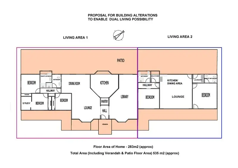 The house has garaging for 2 cars plus a separate, self-contained guest/granny flat accommodation. With very little change, the granny flat could be extended as per plan attached to a flat consisting of 2 bedrooms, 2 bathrooms and open plan living area.