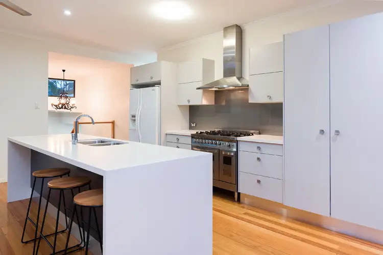 Practical kitchen with chef style 5 burner gas stove/ oven, ducted range hood , ample integrated storage, soft closing drawers, stone bench tops, glass splash back