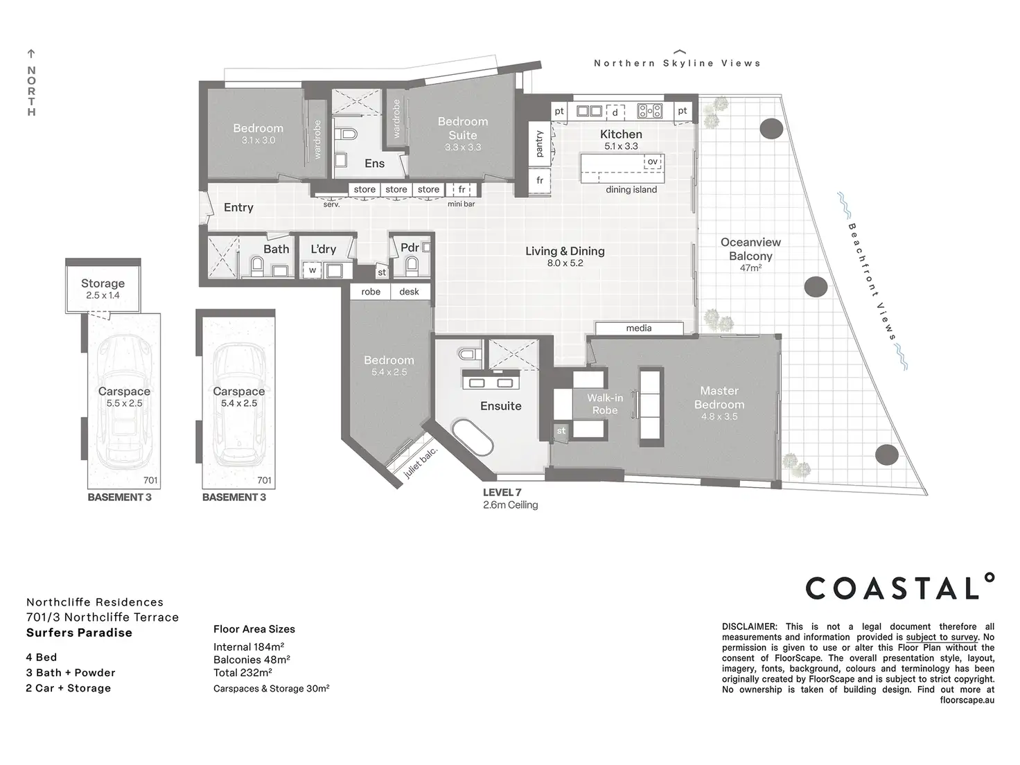 Apartment 701 boasts 232m2 of luxury absolute beachfront living and features 3 large bedrooms + Media "or 4th bedroom", 3 ensuited bathrooms + separate guest powder room, gourmet kitchen offering the latest in European appliances and stone finishes and an oversized balcony ideal for entertaining whilst enjoying stunning ocean views up and down the coastline never to be built out.