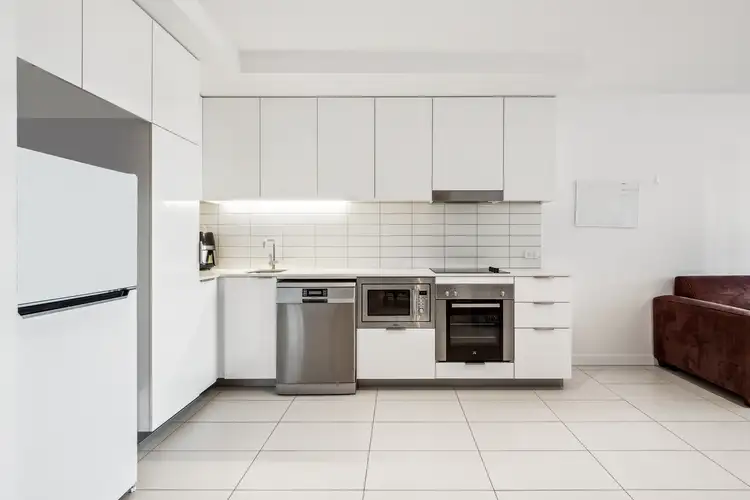 The apartment features neutral finishes, with crisp white tiles adding a fresh, modern touch. The kitchen is equipped with a Caesar stone benchtop, ample storage, a dishwasher, and a microwave/convection oven. An internal laundry with a clothes dryer adds extra convenience.