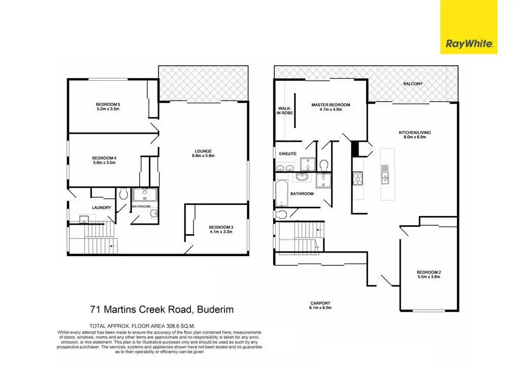 Over two levels, the home is complete with five bedrooms, three bathrooms, two separate living areas, well-equipped galley style kitchen, upper and lower timber decks, separate laundry, double carport plus garden shed and three large rainwater tanks.