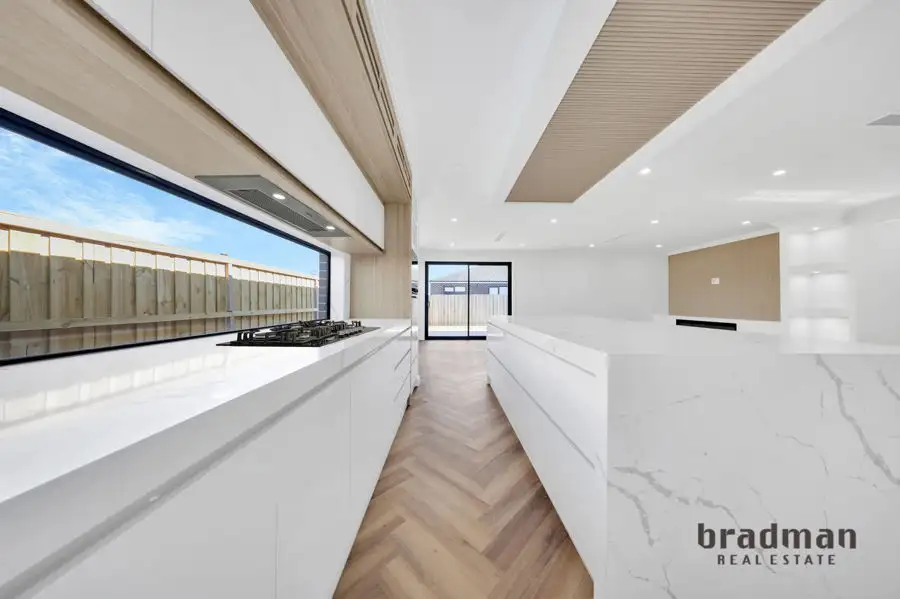 Designed for easy living, the open-plan layout seamlessly connects the kitchen, dining, and living areas, creating a bright and inviting space for everyday life and entertaining. The stylish kitchen features stone benchtops, premium stainless steel appliances, and a walk-in pantry, catering to both practicality and elegance.