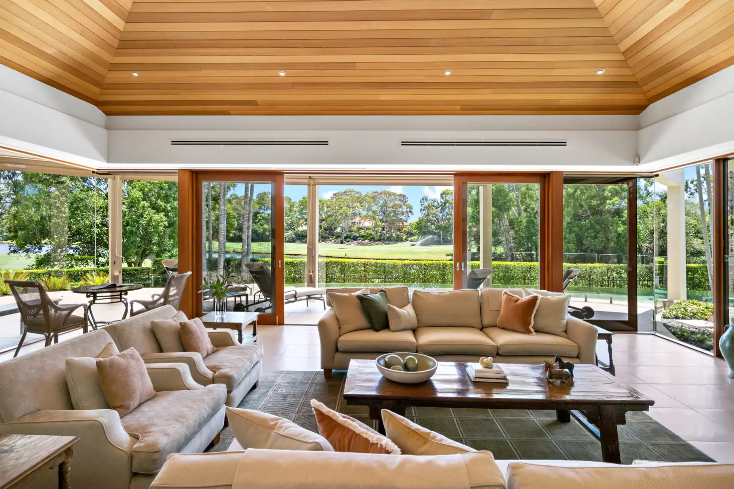 Inside, the home's architectural design effortlessly blends Art Deco-inspired features with modern luxury, offering expansive living spaces filled with natural light. The gourmet kitchen is an entertainer's dream, while the spacious bedrooms provide private sanctuaries, each with access to its own outdoor terrace and golf course views.