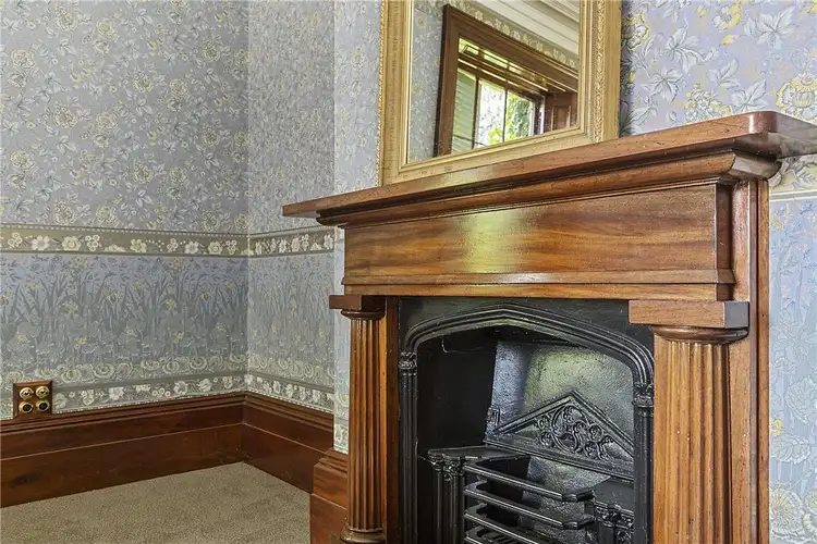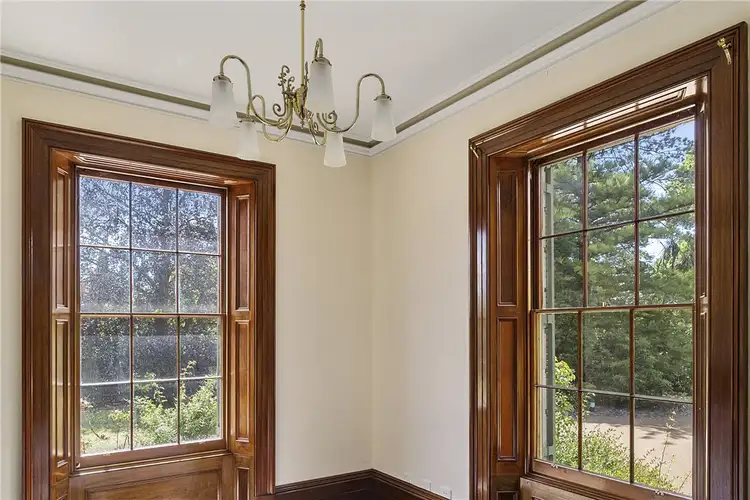 Approaching through the circular driveway, the handsome Georgian façade presents symmetrical windows either side of the entry. Through the timber front door is a carpeted foyer, with a sitting room to the right and lounge to the left. The lounge, known as the Blue Room, is lined with ornate custom-made and hung wall paper, designed to match the original wallpaper, a strip of which is on display and preserved beneath perspex. An elaborate ceiling rose, open fireplace and deep-set timber window frames create a grand room. The three rooms on the right side of the house each have fireplaces with original timber mantels. The third room has a powder room and dressing room. A kitchenette is central to the floorplan.