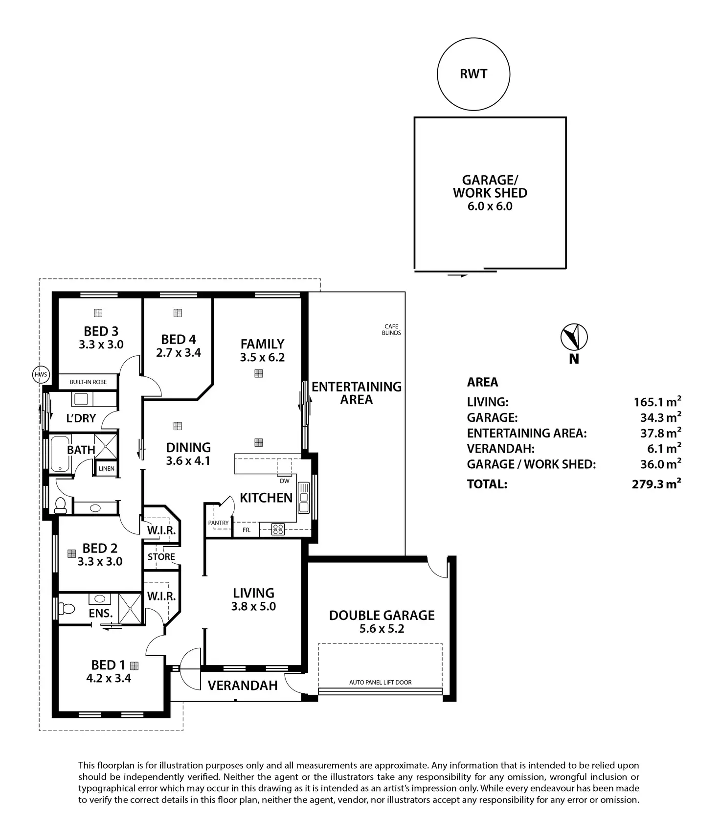 • The double garage under main roof has remote roller door and a concreted drive provides easy access to the 6m x 6m shed (with concrete floor & power)