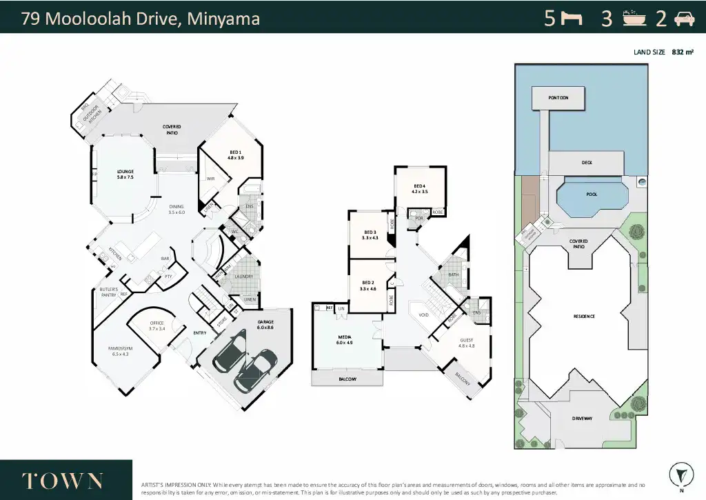 Across two levels, covering approximately 540m2, the home comprises formal entry foyer, five bedrooms, three bathrooms, two powder rooms, full sized home office, gym/multipurpose room, media room, two north-facing upper balconies, elegant sunken lounge, open plan living/dining, premium kitchen with walk-in pantry, covered patio overlooking solar heated wet-edge infinity pool and river, separate laundry, and double lock-up garage, on a 832m2 block with room onsite to park an additional five vehicles.