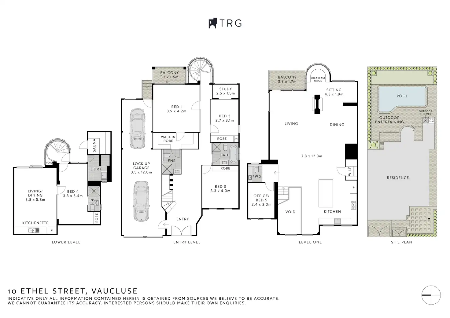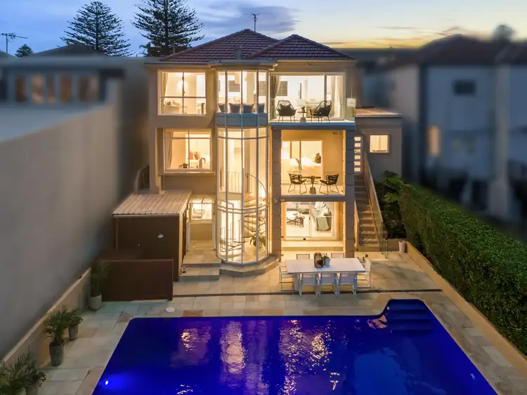 Further highlights include an upper-level study/fifth bedroom, a deluxe main bathroom, guest powder room, ducted air conditioning and extensive internal storage. A glass spiral staircase leads to a laundry, sauna and an outdoor shower.
