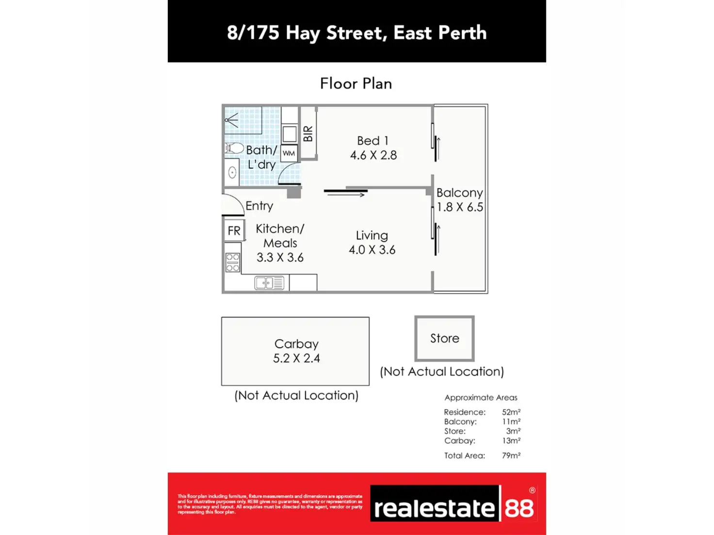 - Internal: 52m2, Balcony: 11m2, Car Bay: 13m2, Storeroom: 3m2, Total Strata Area: 79m2