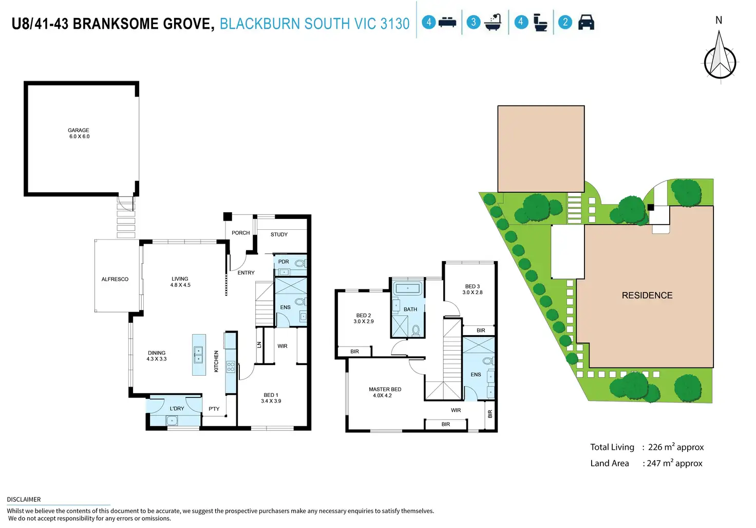 Restfully residing on the upper level, the three bedrooms all include robes, with the master bedroom boasting a walk-in-robe and ensuite, further served by a family bathroom, separate upstairs toilet, separate downstairs toilet plus a laundry and study nook.