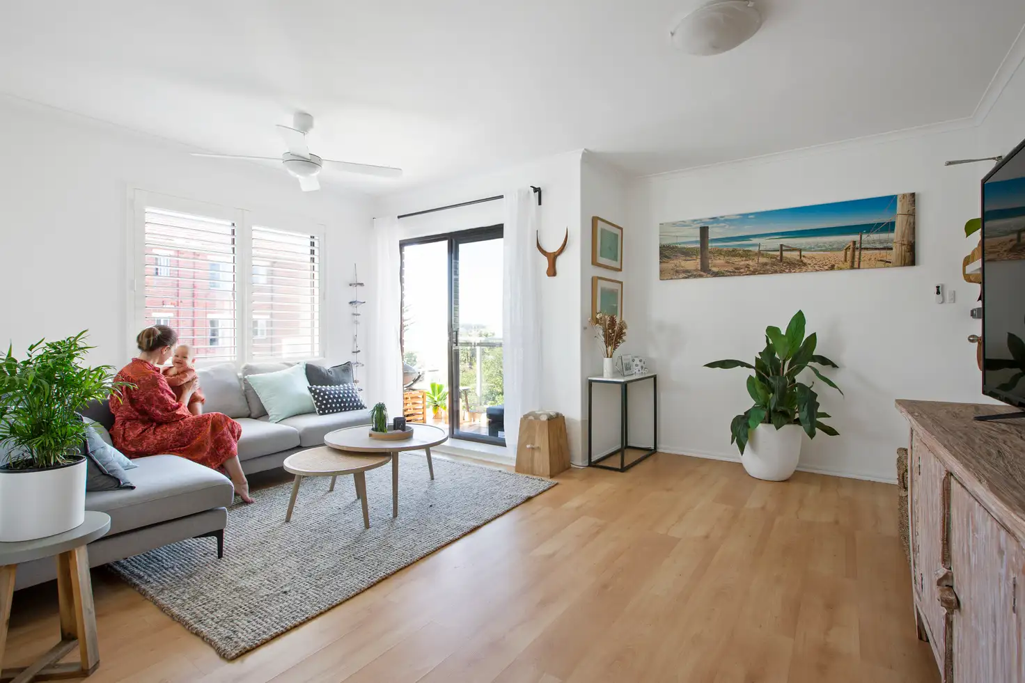 • Elegant light-filled living area with easy-care floorboards and a ceiling fan. Flowing out from here is a balcony with a retractable awning that is the best place to sit back and enjoy the spectacular ocean and district views.