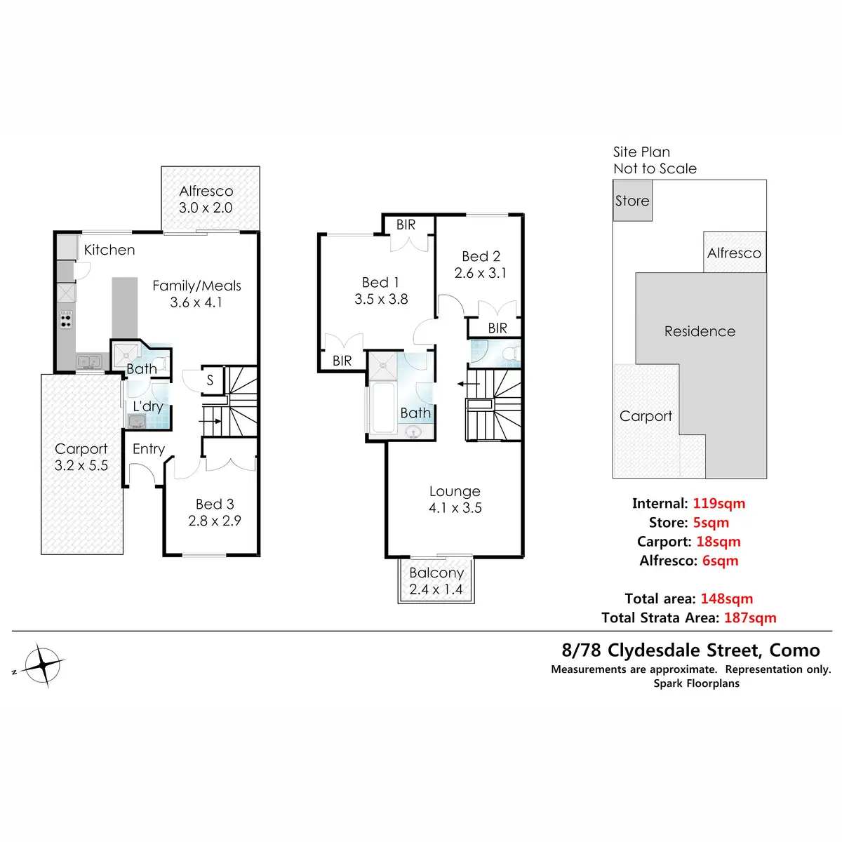 - 187m2 total strata, car port, living on two levels