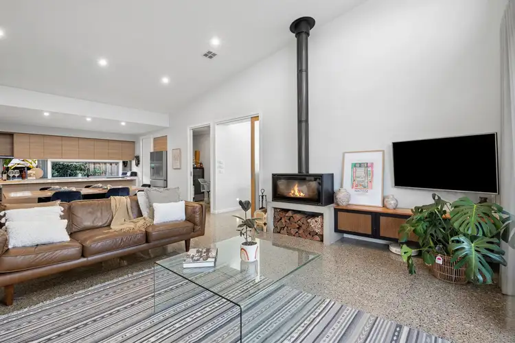 Open Plan Living: Centered with a wood fire heater and set below a soaring skillion roof-line, living and dining proportions continue across polished concrete floors, back dropped by custom window furnishings and highlight windows.