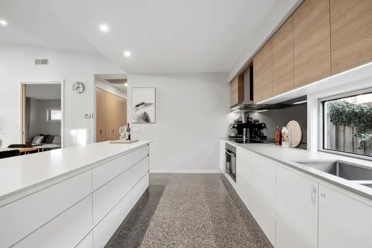 Kitchen: Sleek in aesthetic with slimline stone bench-tops, two-tone cabinetry (including overheads), electric cooktop and underbench oven. Completing the picture with a walk-in pantry, LED strip feature lighting, stainless steel rangehood, dishwasher, polished concrete floors, splash-back window and breakfast bar.