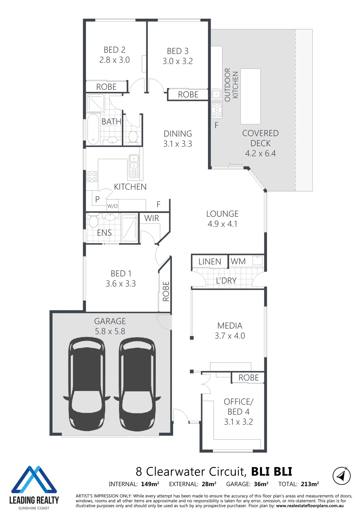 Across a single level with a well-designed floor plan; the home comprises four bedrooms, two bathrooms, two separate living areas, central kitchen, expansive north-east facing alfresco deck with fabulous outdoor kitchen (now youre talking), separate laundry with external access, and double lock up garage plus additional onsite parking and gated access to bring in jet-skis, bikes etc.