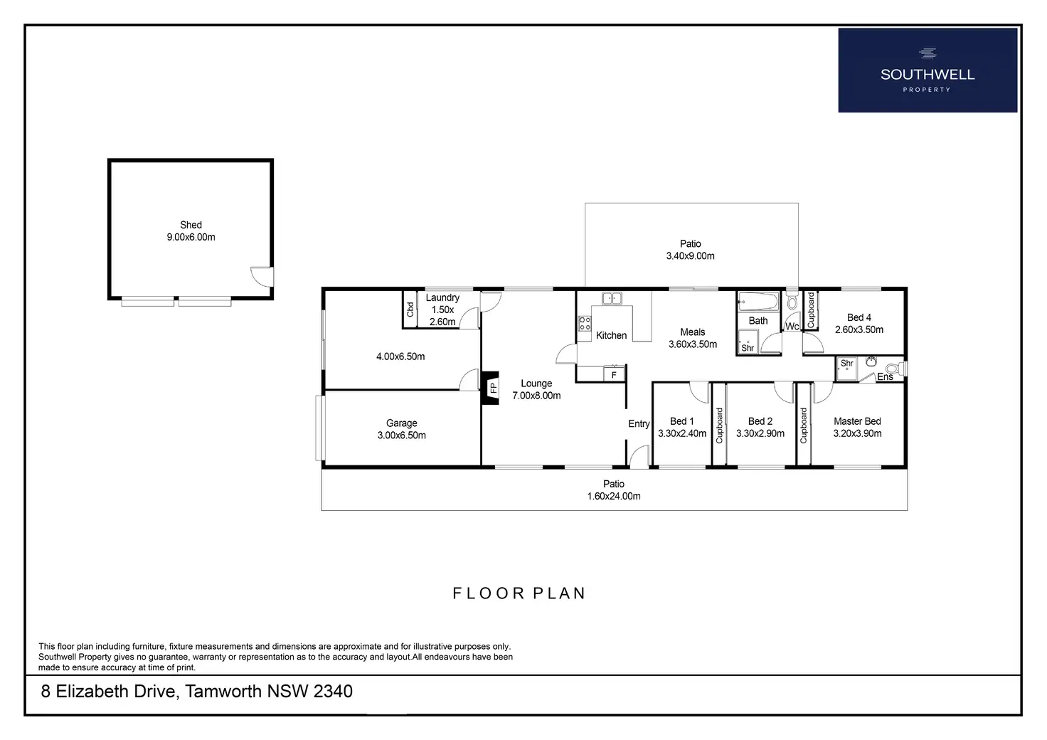 - Freestanding three-bay shed with power, concrete floor and roller doors, plus extensive driveway parking