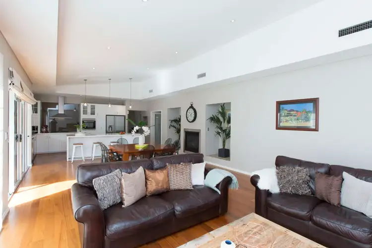 Double doors reveal an impressive home theatre room that is carpeted for comfort and will fulfill all of your cinema-style pleasures. Striking timber floorboards highlight the bedrooms, as well as a super-spacious informal open-plan family and dining area that oozes class and style with its high bulkhead recessed ceiling, recessed feature walls, feature down lighting, a gorgeous built-in fireplace and funky light fittings.