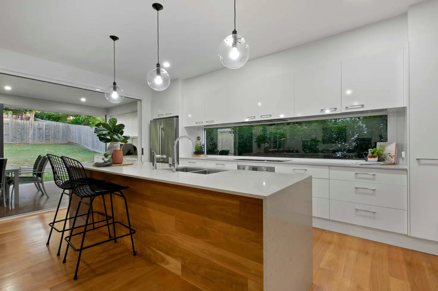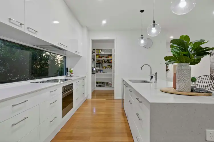 Entering the home and ascending up the lush timber stairwell you will find the well-appointed kitchen, perfectly positioned to service the expansive open plan living area - offering waterfall CeaserStone benchtops, soft close cabinetry, stainless steel Smeg appliances and an abundance of storage. The expansive butler's pantry also provides the convenience of easy entertaining and comfortable living with a laundry built in. The covered timber patio is an entertainer's dream, with a built in 6 burner Weber Summit BBQ completing the outdoor kitchen. Year-round comfort is assured with ducted air conditioning, Crimsafe screening, and tinted windows throughout.