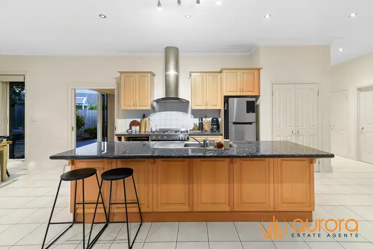 The gourmet kitchen vaunts stunning black granite countertops and a spacious five-seater breakfast island. Abundant timber-look shaker-style cabinetry provides storage space. The kitchen boasts a freestanding electric oven, gas cooktop, gourmet rangehood, a stylish tiled splashback and a stainless steel dishwasher.