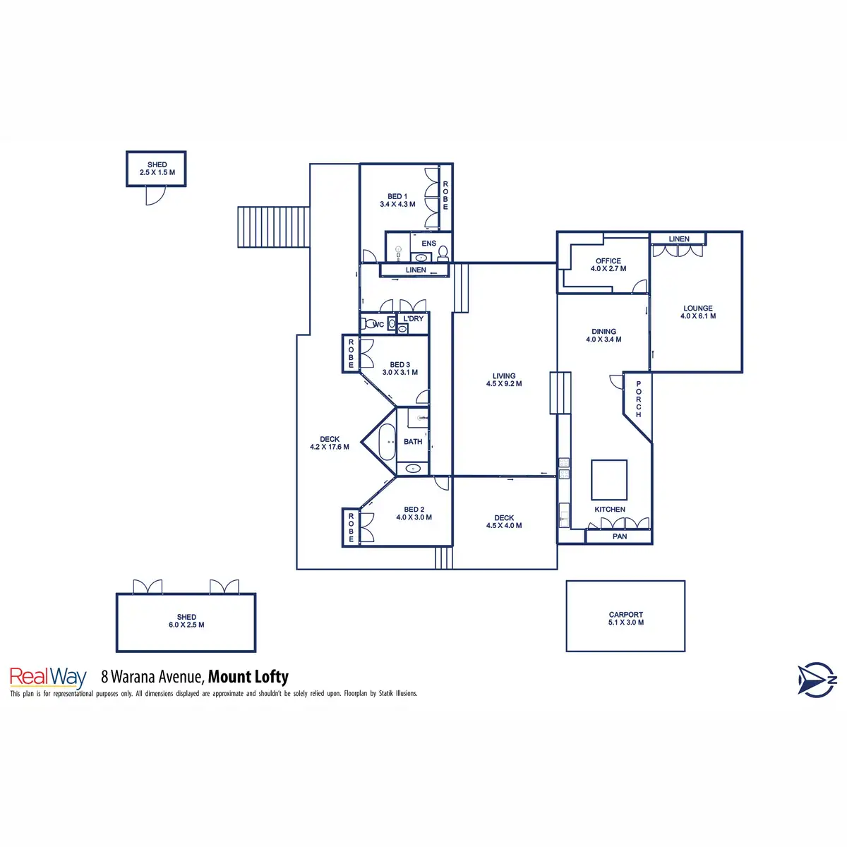 The inviting master suite has generous proportions, an ensuite, a built-in robe, and a ceiling fan for your comfort The remaining two bedrooms, all of which have access to the magnificent timber deck, they all have built-in robes and are fully carpeted. A large home office/workspace with a generous built-in desk and bookcases could easily be converted into a multipurpose room, an extra bedroom, or even a library.