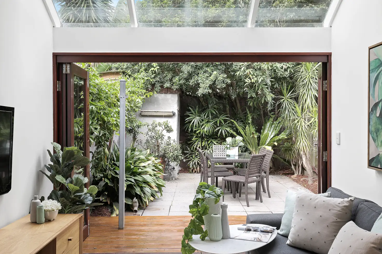 - Picturesque entertainer's courtyard, leafy backdrop, Northern aspect