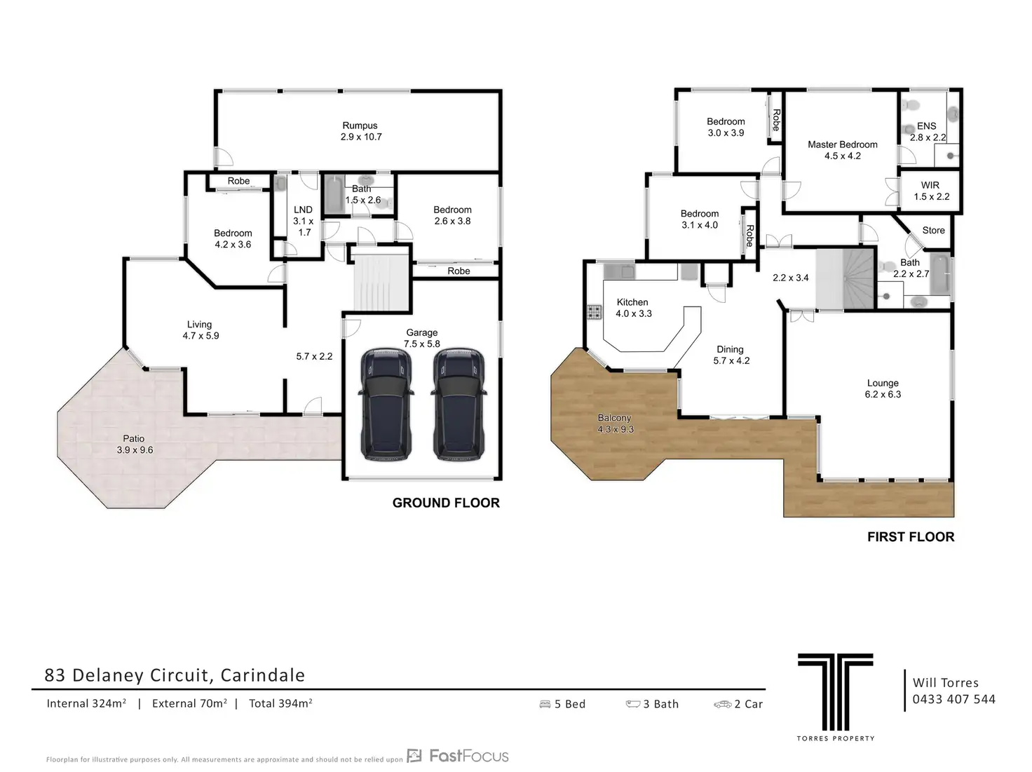 Five large bedrooms and three bathrooms span two levels. Two bedrooms are downstairs, and three are upstairs, including the master retreat, boasting a walk-in robe and ensuite.