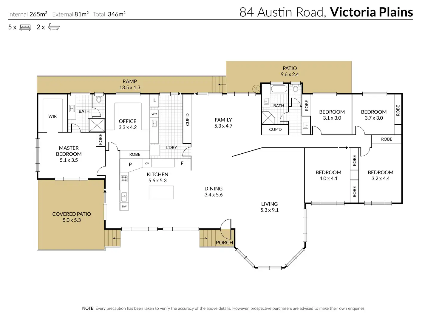The home is an executive style residence with of 5 bedrooms, 2 bathrooms, bar/sitting room plus an office. The kitchen has a large island bench, considerable cupboard storage and flows effortlessly into the dining and lounge areas, all of which are set up to take advantage of the exceptional rural outlook. There is a good sized deck just off from the kitchen and a large gravelled area ideal for fire pit and entertaining, again, taking advantage of the views. An internal laundry and ramp entry at the rear of the home complete the picture. The home is fully air-conditioned with split systems and all bedrooms have built in cupboards and ceiling fans. Construction is brick with iron roof.