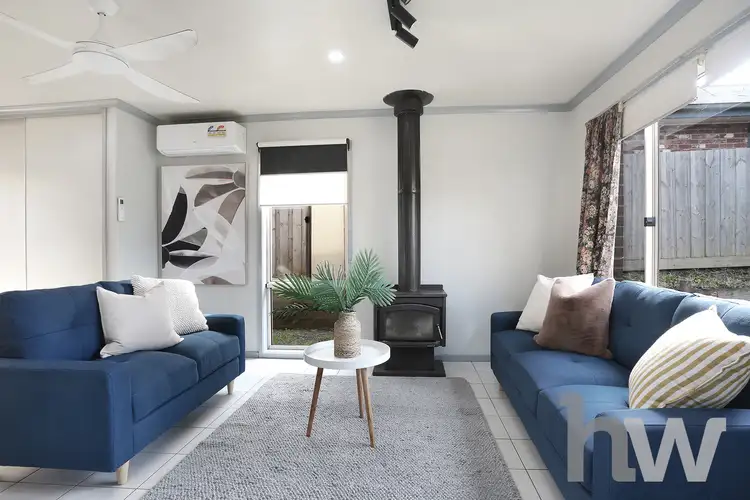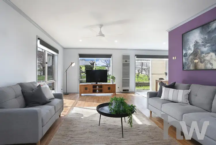Comprising 3 bedrooms all with built-in robes, the master enjoying split system heating/cooling and a full ensuite with shower, vanity and toilet. A versatile sitting room at the fore of the home through double doors which also includes a wood heater, ceiling fan, split system, and European laundry with additional storage an access to the outside undercover area. The large 2nd living zone is light bright and open plan, overlooking the dining area that has sliding door access to the front gardens, equipped with ceiling fan, split system heating/cooling and gas wall heater. The kitchen is tucked away with ample cupboards, pantry space and gas cooking.