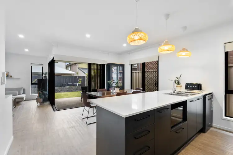 The heart of the home is the spacious kitchen, featuring sleek stone benchtops, an electric cooktop, a dishwasher, and a breakfast bar. With plenty of preparation space and ample storage, it's perfect for cooking, meal prep, and entertaining guests. The open-plan design ensures seamless interaction between the kitchen, living, and dining areas, creating an ideal space for family gatherings and social occasions.