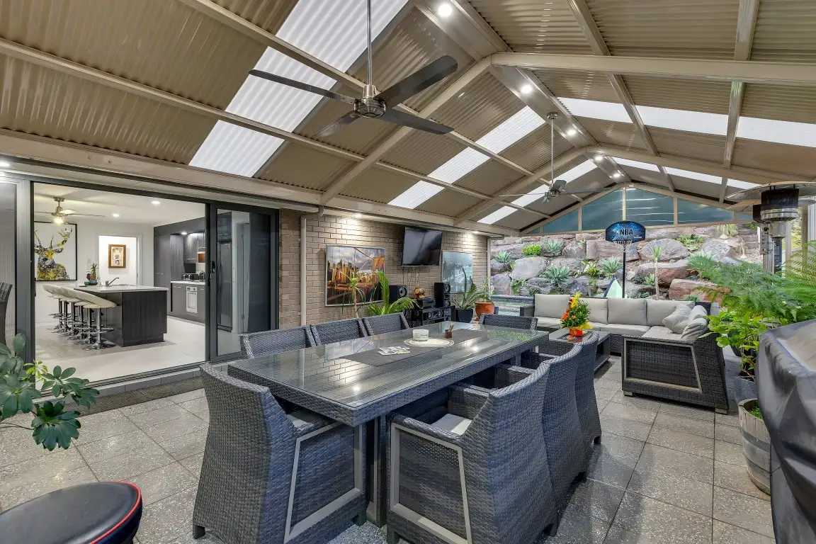 Stepping through the double glass sliding doors you will find a massive pitched pergola, with room enough for both dining area and casual seating. There is two ceiling fans and plenty of lighting for year round entertaining with family & friends. This great entertaining area is overlooked by rock retaining walls and low maintenance established gardens. The back of the block has been well planned and landscaped, with two tiered grass areas for the kids to play. These great areas are complimented by more garden beds and more views over the hills. Down the side of the block are some young fruit trees and a handy garden shed for added storage. To the front of the home is a double garage with panel lift door and a beautifully established modern garden. There is also an 8 panel solar system for added energy efficiency.