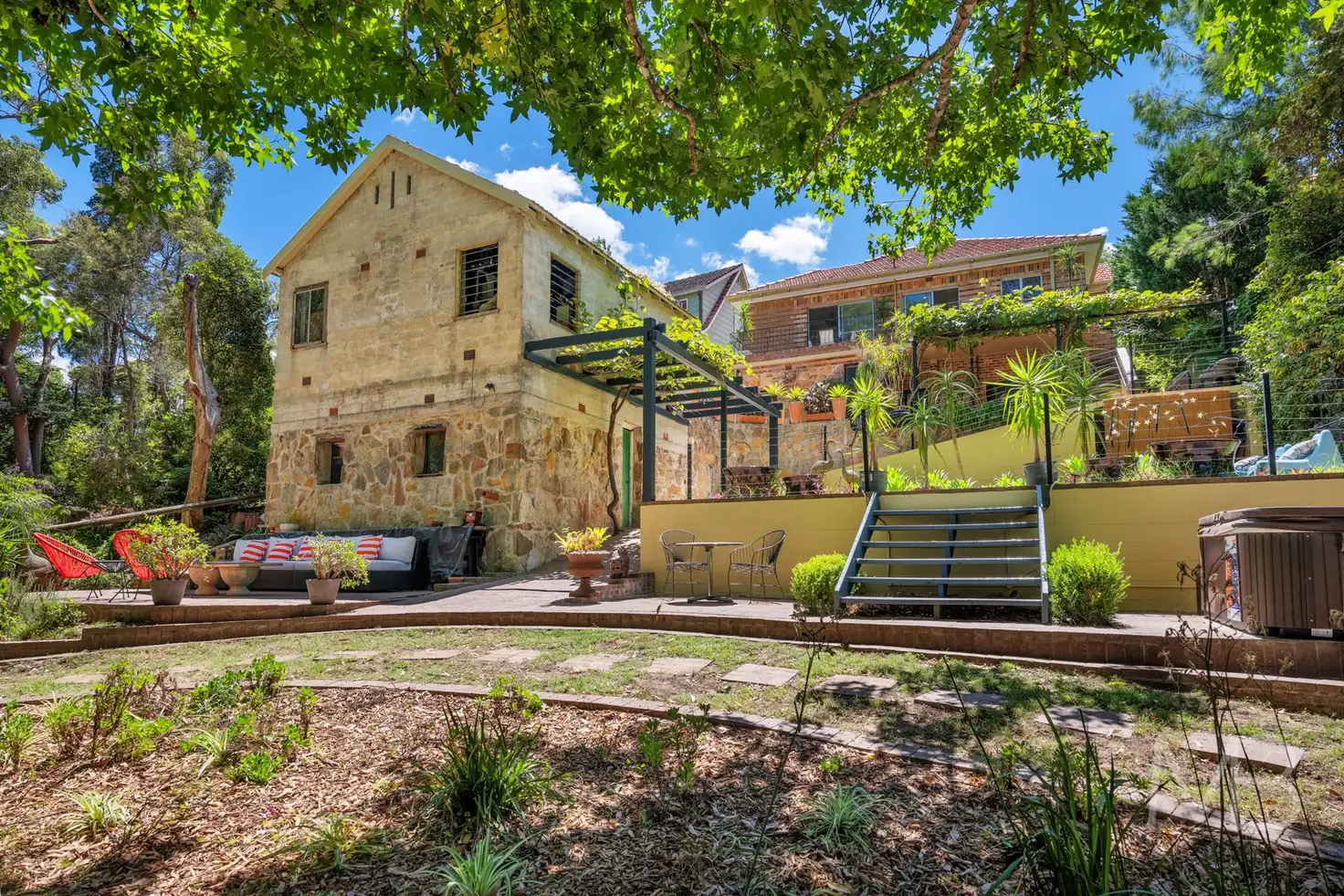 Echoing the rustic charm of Tuscany, the garden is accented by a vine-laden terrace and a stone outbuilding which offers extraordinary flexibility