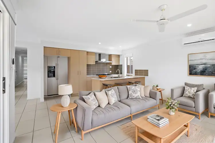 As you step through the wide front door, you're greeted by a bright hallway that leads you into the heart of this beautifully designed home. The spacious open-plan kitchen, dining, and lounge area is filled with natural light, making it perfect for both everyday living and entertaining. The modern kitchen features stainless steel appliances, a gas cooktop, and ample storage, ensuring a functional and stylish cooking space.
