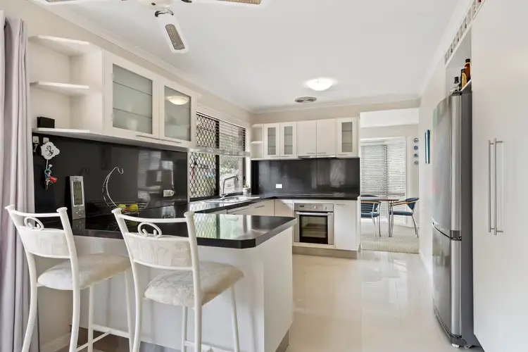 The kitchen is practical and well positioned, overlooking the living areas and backyard. With a breakfast bar style countertop, large sliding windows, and excellent ventilation, it is a space that works effortlessly for busy mornings and relaxed family meals.