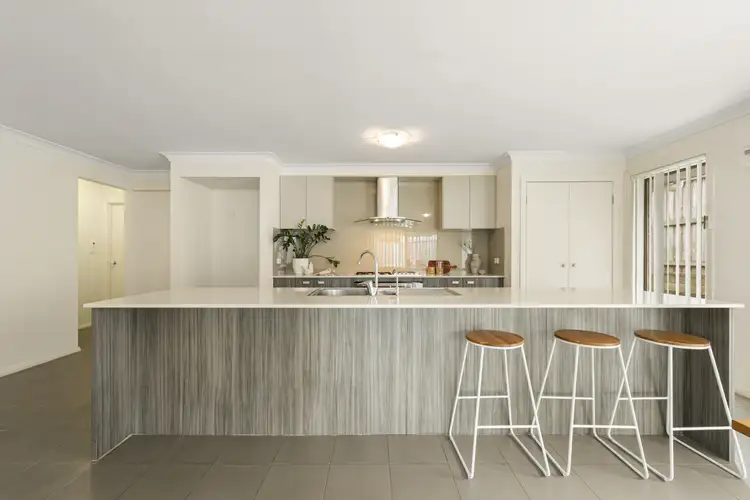 - A gourmet kitchen features a stone-topped island bench, breakfast seating & timber-look cabinetry