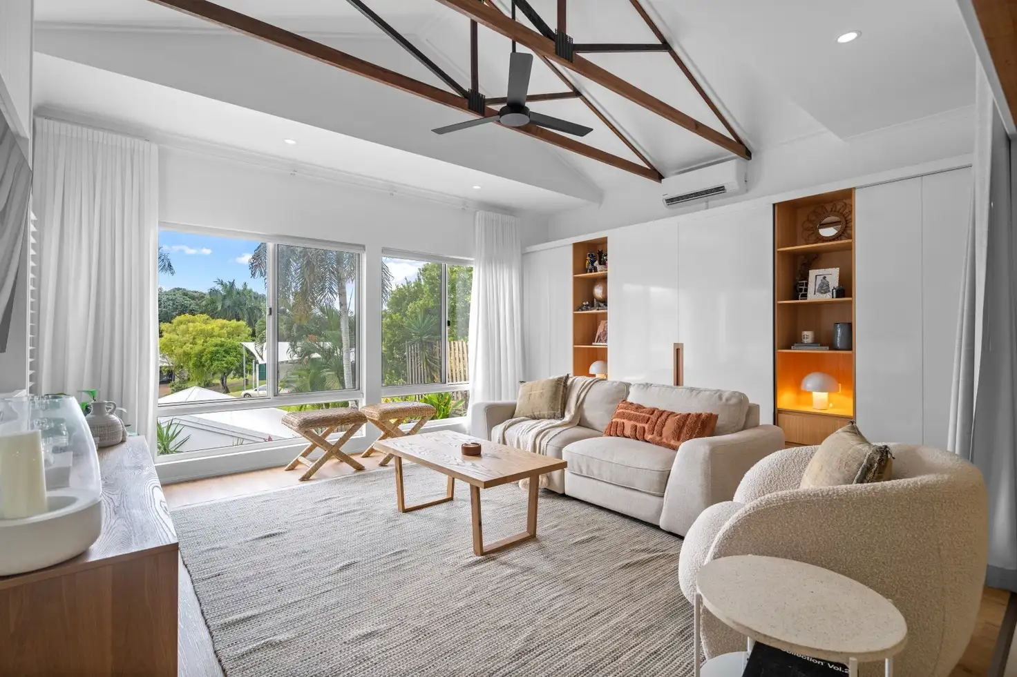 The sophisticated lounge complete with built in home office features timber floors and plantation shutters, inviting you to relax amidst natural light and cooling cross breezes. A separate family room with floating hybrid timber floors offers versatile living options, featuring custom-built storage cabinets and a cleverly concealed Murphy bed for visiting guests.