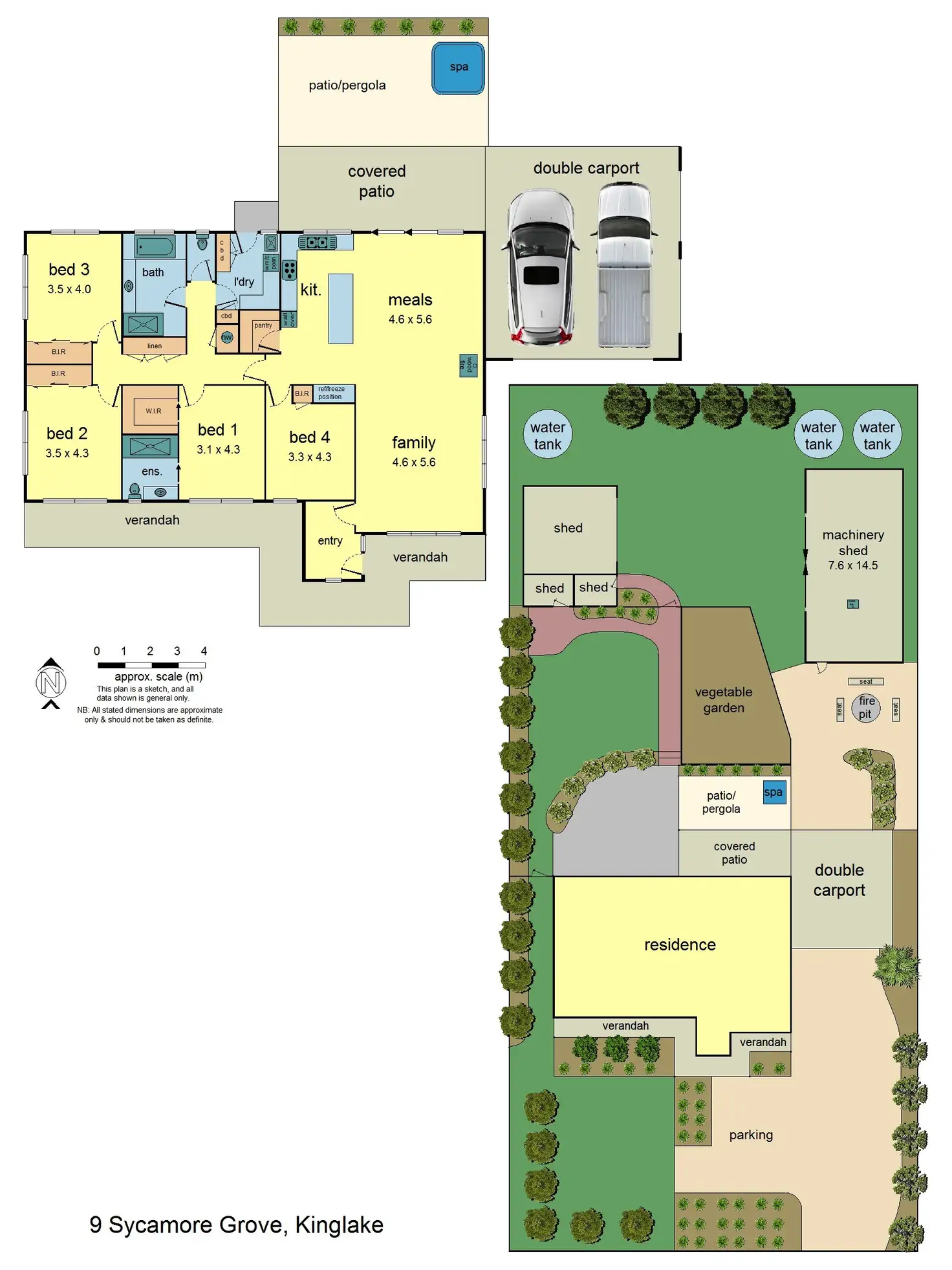 Outside, the delightful shaded rear deck area has a brick BBQ chimney, raised garden beds with mature hydrangeas and daisies, bluestone and old brick retaining walls and granite stones lining the edge of the garden. The back yard is lawned with a brick paved area, garden shed on concrete floor with power and a brick path leading to a fantastic enclosed vegie garden with large raised beds and water access. A gate accesses a rear backyard with lemon and lime trees, and a garden shed/chook pen and open wood shed. A large machinery shed with two full-height sliding farm doors is on a concrete slab with power and plumbing for water; there’s even a fire pit to enjoy drinks around on a summer’s evening.
