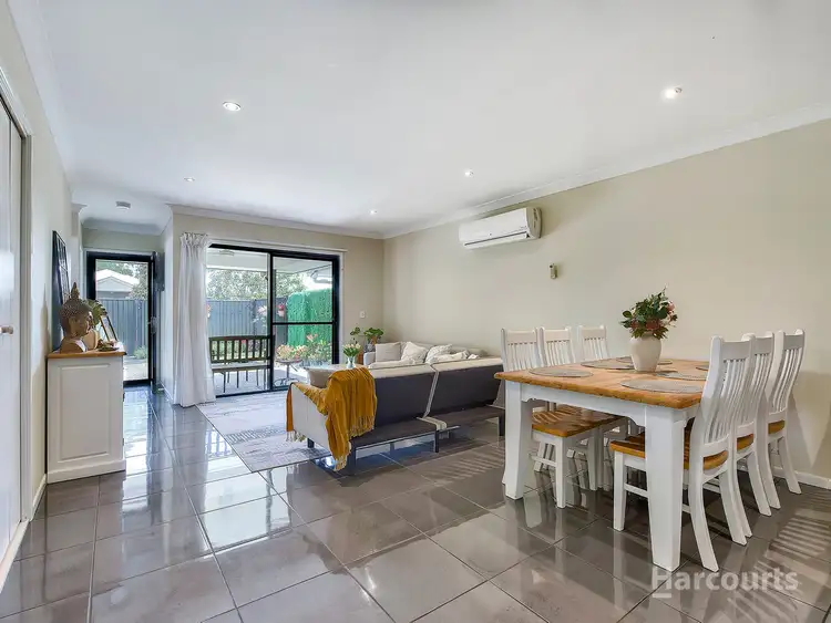 Step inside to discover the tiled open-plan kitchen, living and dining area, where each space flows effortlessly together. The kitchen is well equipped with a gas cooktop, double sink, dishwasher and a breakfast bar bench, making it both functional and ideal for entertaining. Overlooking the dining and living zones, this area also features air conditioning to ensure year-round comfort.