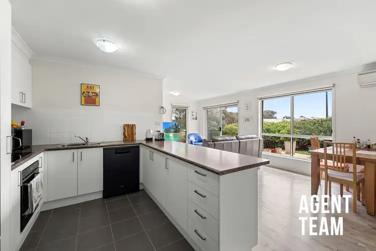 The sunlit open-plan layout connects the kitchen, dining, and living areas seamlessly, creating a welcoming space for both everyday living and entertaining. The modern kitchen features generous benchtops, electric cooking, a dishwasher, and ample cabinetry, ideal for those who enjoy cooking and hosting. Quality finishes throughout include LED downlights, Karndean vinyl flooring, and sheer and block-out window furnishings for year-round comfort.