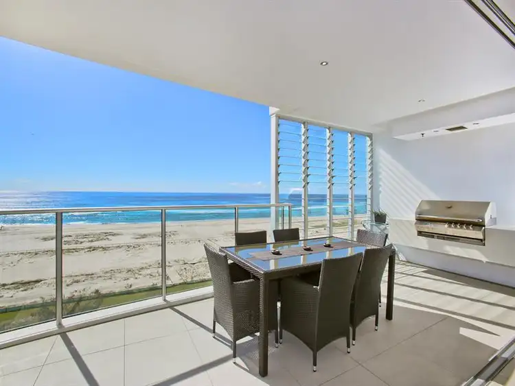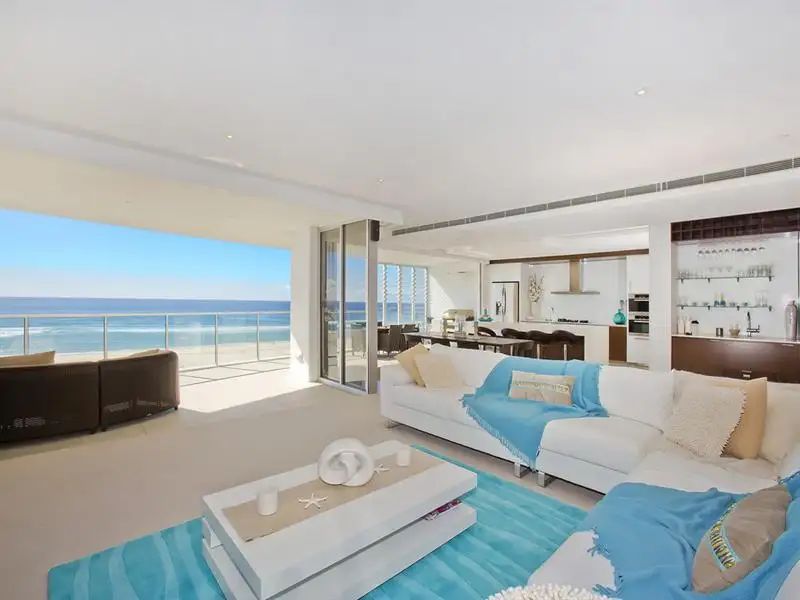 Sweeping coastline views from Snapper Rocks to South Stradbroke Island paint a stunning backdrop to this ninth floor 380 m2 apartment in Kirra's premier beachfront tower, Elysee Residences.