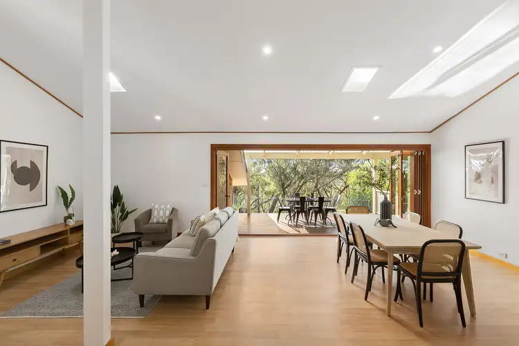 Outdoor living is elevated with an expansive deck that doubles as an entertainment hub. With views through the bushland and a glimpse of the ocean, this space is the epitome of relaxation and entertainment. A separate studio further enhances the living options, offering flexibility for a variety of pursuits.