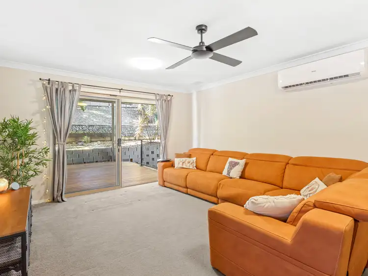 - First split-level zone: cosy carpeted lounge room with ceiling fan, air conditioning, and sliding door access to the outdoors