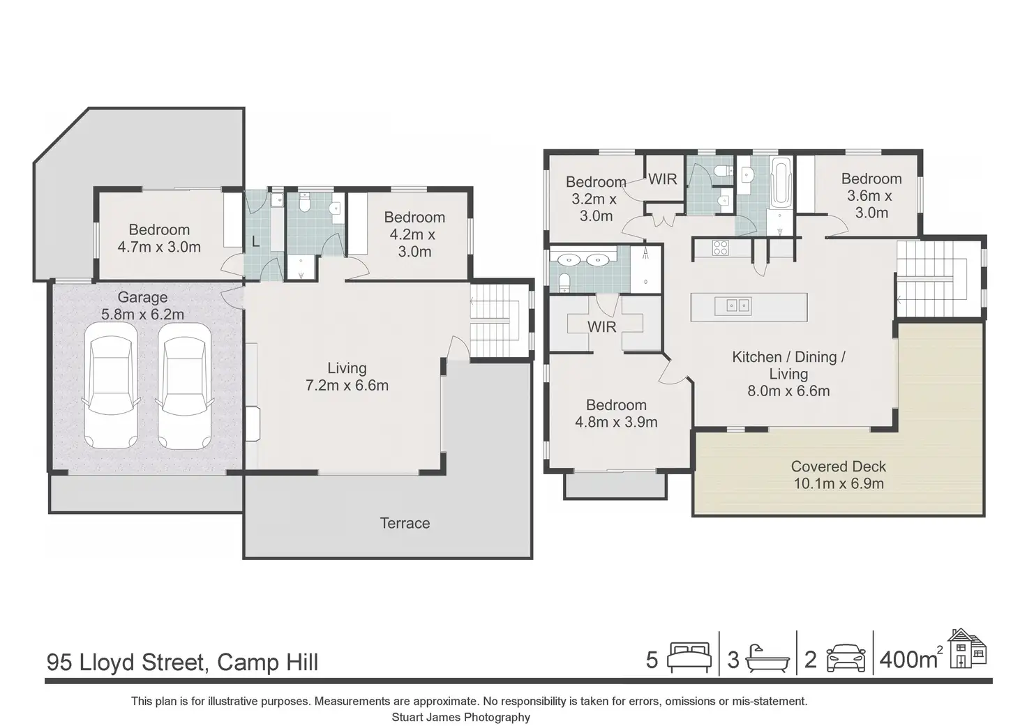 - Five bedrooms, three bathrooms, double garage