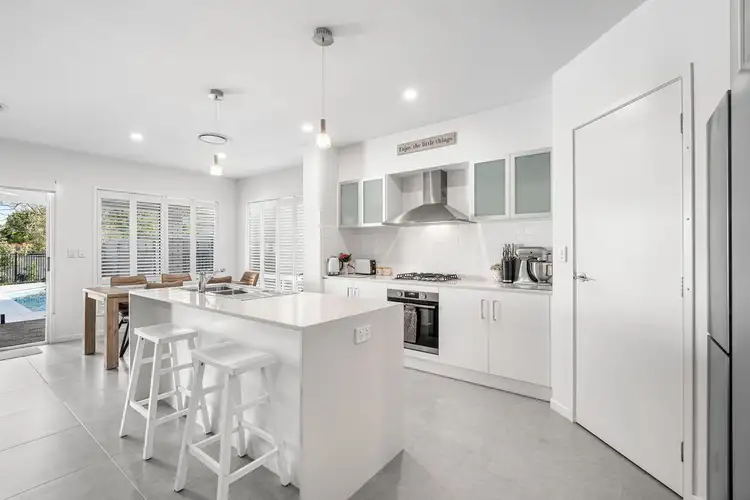 The family-friendly design invites effortless indoor-outdoor movement, with the open kitchen, living and dining area unfolding to your blissful alfresco entertaining retreat. Featuring a covered patio, manicured gardens, grassy lawns, and a heated mineral pool resting behind privacy screens and garden lighting, this hideaway creates an idyllic atmosphere across the day and night.